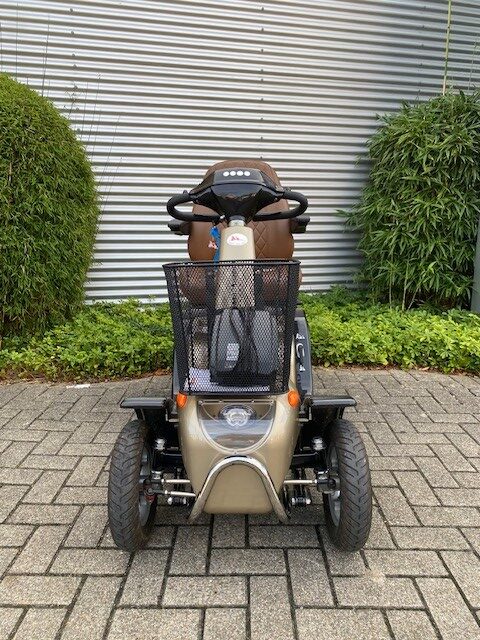 De Solo 4 Elegance is niet alleen het beste paard van stal maar ook de mooiste! Deze Solo is van alle gemakken en luxe voorzien. Gaat u een lang stuk rijden in het buiten gebied? Dan activeert u de cruise control op de scootmobiel. De Solo leent zich ook uitstekend voor het verplaatsen in stad of dorp. De scootmobiel remt automatisch af in de bocht. De richting aanwijzers bediend u in het stuur, u houdt dus ten alle tijden de handen aan het stuur. De Solo scootmobiel staat bekend om zijn ultieme veercomfort waar door deze scootmobiel perfect is voor mensen met pijn klachten of als je ongehinderd wilt genieten van het rijden in een scootmobiel. Als het gaat om uitstraling zit u in de deze scootmobiel perfect! Naast bediening en functionaliteit is er bij de Elegance veel aandacht besteed aan het uiterlijk. Deze Solo is exclusief uitgevoerd in een luxe champagne kleur. Het Vespa windscherm en de verchroomde achteruitkijkspiegels sluiten perfect op elkaar aan! Om het geheel nog fraaier te maken is gekozen om de TM1 stoel te bekleden in een cognac bruine kleur met een ruit patroon.
